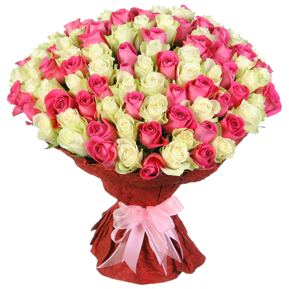Букет состоит из 50 белых роз, 51 розовая роза, розовая упаковка, розовая лента.