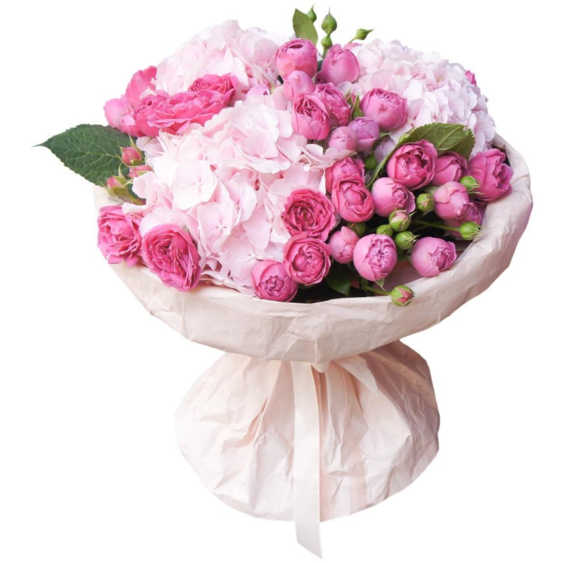 Букет состоит из 3 розовые гортензии, 10 веток пионовидных роз, зелень, крафт.