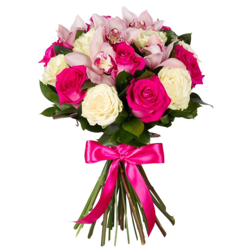 Букет состоит из 16 красных и белых роз, 5 орхидей, рускус, прозрачная упаковка, атласная лента.