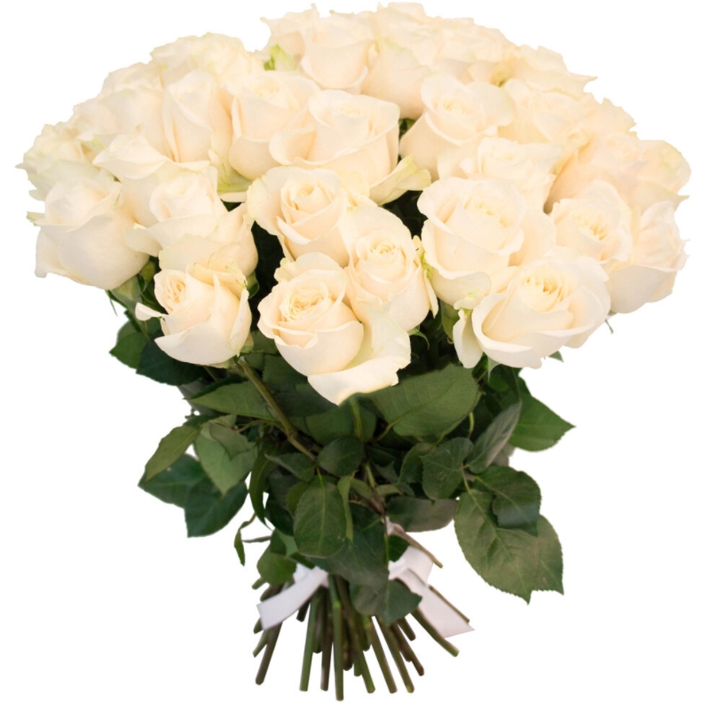 Букет состоит из 45 белых роз, прозрачная упаковка, атласная лента.