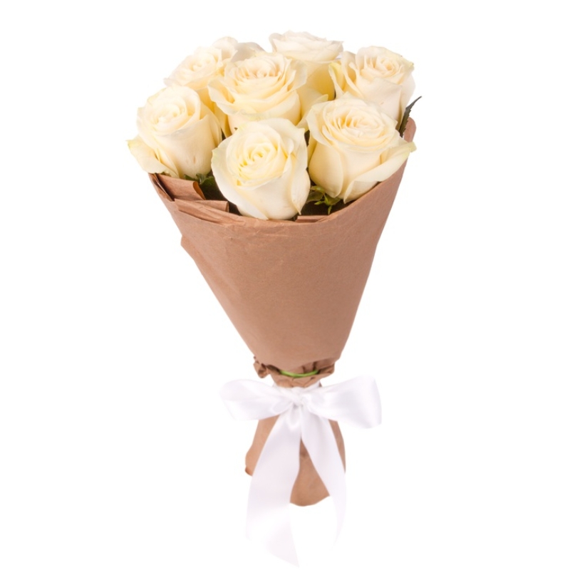 Букет состоит из 7 белых роз, крафт, атласная лента.