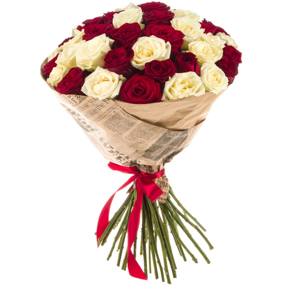Букет состоит из 23 красные розы, 22 белые розы, крафт, атласная лента.