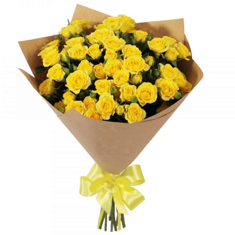 Букет состоит из 11 желтых кустовых роз, крафт, атласная лента.
